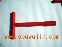 1000V绝缘T型套筒扳手适用于作业空间较小,松开或是旋紧螺丝等不方便的地方,此工具绝缘性能经过第三方质量认证,达到10000V带电作业无发热及击穿要求,适用于1000V交流电压及1500V直流电压下带电作业,绝缘工具的表面通体为红色,手感好,无滑脱。