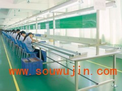 考虑到它是装配工人们的办公场所,皮带流水线两侧会装备长条形(300MM-400MM宽)或独立的工作台(800MM*600MM);顶部是日光灯和摇头风扇;日光灯架上布置工艺挂板、工具台或零件盒;沿线会有供电供气的动力源管道,工人操作处有电源插座、快速气接头、电气动工具、脚踏开关等装置