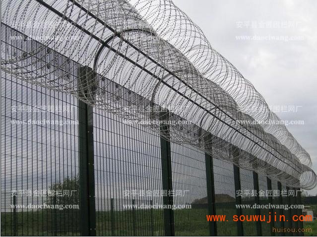 刀刺网应用广泛。监狱防护网所用网片均为低碳钢丝焊接而成,常用丝径为塑后5mm,立柱间距为2.5米或者3米 网孔为50*50 或者50*100