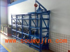 模具架主要用于存放各类模具物品,一般可分为标准型模具架和重型模具架。顶部可配置移动式葫芦小行车,以方便起吊模具。