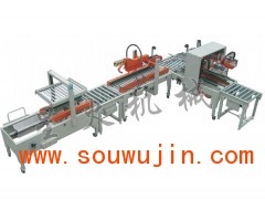 适用于纸箱规格变化不太频繁的场合,自动完成上、下中缝的自动封箱和“ # ”字捆扎。有连续封底、自动折盖封箱及“ # ”字或多道捆扎包装的功能。可方便的通过人工调整适应纸箱大小变化。