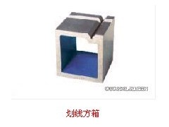 铸铁方箱分为划线方箱、检验方箱。是有灰口铸铁制成,一般是100毫米到500毫米见方的正方体,尺寸精度在0.01毫米之内,相对平面互相平行,相邻平面互相垂直,允许误差均在0.01毫米之内。方箱也有许多种。有些工件用C形夹头夹在方箱上,翻转方箱就可一次划出全部互相垂直的线来。为了便于夹持各种工件(包括轴类工件),可采用附有夹持装置,常用一般规格的划线方箱一个工作面加工有横竖两道v型槽。