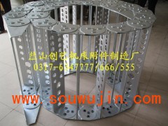 钢制拖链的主体是由链板(优质钢板镀铬)支撑板(挤拉铝合金)轴销(合金钢)等部件组成,使电缆或橡胶管与拖链之间不产生相对运动,不产生扭曲变形,链板经镀铬处理外形效果新颖,结构合理,灵巧强度高,钢性好不变形,安装方便,使用可靠,易拆装,尤其是本产品采用了高强度耐磨材料,合金铜为轴销,提高了产品的耐磨强度,弯曲更灵活,阻力更小,降低了噪音,从而可保证长时间使用不变形,不下垂。使电缆或橡胶管与拖链之间不产生相对运动,不产生扭曲变形,链板经镀铬处理外形效果新颖,结构合理,灵巧强度高,钢性好不变形,安装方便,使用可靠,易拆装,尤其是本产品采用了高强度耐磨材料,合金铜为轴销,提高了产品的耐磨强度,弯曲更灵活,阻力更小,降低了噪音,从而可保证长时间使用不变形,不下垂