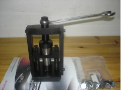 c、操作简便,用外六角扳手(外六角扳手用起来方便些)或活扳手旋转,使上模逐步向下压,直至把电池边缘高度压到所需要求即可,或旋转力度到一定程度,说明已经封口完毕(当然这个力度是凭经验和感觉,操作两三次就知道了),然后再用扳手向上回转,此时上模逐渐抬起,当上模与下模完全脱离0.5-1cm间隙,再用手指把下模向下压,电池自然就弹出来了。