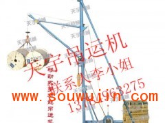 天宇金燕牌移动式多功能吊运机,是我公司08年度研发,2009年推出的主力机型。本机可完成室内普通环境吊装,可根据窗户的高度调整高低,还可用于小窗户型的吊装,实现了多大的窗户就可吊进多大的货物,更可用于楼顶吊装,室外装车卸车,主机还可做为一台两相电源小型卷扬机使用,真正实现了吊运机的多功能,在各种工作环境下出色完成作业,实现一机多用,让用户花一样的钱。办尽可能多的事,使用时可铺设两根4#、5#角钢做道轨。