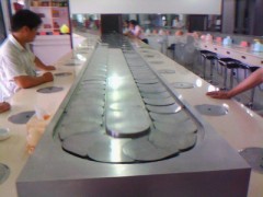 鹤岗自助回转火锅 鹤岗自助回转寿司主要用于日本料理、韩国料理、西餐厅及自助餐厅等,速度为0-5米/分钟可调节,链板为特制月牙形不锈钢链板,其设备安装后,业主可根据自身情况可进行装修,客人用餐台面可用大理石或实木装修,设备还可根据业主餐厅布置的要求,来做不同形状,其价格合理,外观精美,无噪音等特点。火锅线,旋转寿司线,旋转火锅线结构概要: