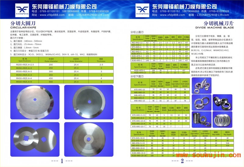 翔锋机械刀片有限公司是一家专业生产分切.分条.分纸.气动圆刀片的厂家,本公司所生产的各种型号规格分切刀.分条刀. 圆刀. (碟型上下刀片.封箱机齿刀,包装机切口刀片,卫生纸虚线切刀,分切机上下圆刀,三键槽分切上刀,分切机刀座,自动锁紧刀座,平圆刀,大圆切刀,自动切台机圆刀,胶管分切圆刀,皮革分条刀,钢管圆切刀,胶带分切刀,油墨刮刀,折页机刀片,轴承圆刀,纸护角切刀,油墨刮刀,涂布刮刀,起皱刮刀,清洁刮刀,环氧树脂刮刀,高分子刮刀,碳纤维刮刀,酚醛棉布刮刀,磷青铜刮刀,不锈钢刮刀等产品,我公司所生产的产品主要服务于造纸、纸箱、五金、塑胶、食品、电子、胶粘带制品.橡胶.铜箔.铝箔.绝缘材料.化纤.无纺布.园林等行业。 本公司用立足于产品的质量管理,以优秀的品质,合理的价格,完善的服务为信念.热忱欢迎国内外客户来电.来函定购.