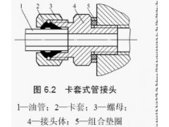 卡套式管接头 图 6.2所示为卡套式管接头结构。这种管接头主要包括具有 24°锥形孔的接头体4,带有尖锐内刃的卡套2,起压紧作用的压紧螺母3三个元件。旋紧螺母3时,卡套2被推进24°锥孔,并随之变形,使卡套与接头体内 锥面形成球面接触密封;同时,卡套的内刃口嵌入油管l的外壁,在外壁上压出一个环形凹槽,从而起到可靠的密封作用。卡套式管接头具有结构简单、性能良好、 质量轻、体积小、使用方便、不用焊接、钢管轴向尺寸要求不严等优点,且抗振性能好,工作压力可达 31.5MPa,是液压系统中较为理想的管路连接件。