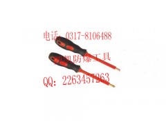 防爆一字螺丝刀的正常规格:50、75、100、125、150、200、250、300、350、400(mm),而我们生产的十字螺丝刀、防爆加顶敲击螺丝刀的产品规格与一字螺丝刀是完全相同的.夹柄螺丝刀、T型螺丝刀、双头螺丝刀这三种产品的规格是完全相同的:200、250、300、350、400、450(mm).
