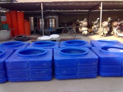 即先将粉状或糊状物料注入模内,通过对模具的加热和纵横向的滚动旋转,使物料借自身重力作用和离心力作用均匀地布满模具内腔并且熔融,待冷却后脱模而得中空制品。由于滚塑的转速不高,产品几乎无内应力,不易发生变形,凹陷等缺点。滚塑工艺主要生产的有:PE水箱储罐、化工储罐、PE加药箱、溶盐箱、塑料水箱、塑料搅拌桶、水塔、酸碱储罐等大型容器从40L-50000L如下图
