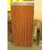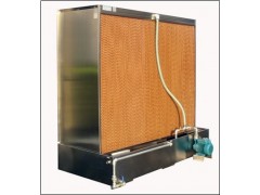 湿膜加湿器由特种波纹蜂窝状湿膜、高效节能风机、水循环系统、浮球阀补水装置、机壳等组成。其工作原理是新风通过湿膜时,产生蒸发现象,变成高湿空气对环境进行加湿。洁净的自来水或冷冻水通过进水管路送到湿膜加湿器下部的循环水箱中,进入水箱的水是由浮球阀或液位开关来控制。水箱的水由水泵送到湿膜顶部的布水器,通过湿膜布水器将水均匀分布,水在重力作用下沿湿膜表面往下流,将湿膜润湿、渗透,当空气穿过潮湿的湿膜时其湿度增加、温度下降,另一部分没有蒸发的水从加湿器底部流回水箱;水箱中的水通过循环水泵反复循环使用,使通过湿膜的空气得到加湿。从而达到节水的目的。当循环水箱中的水位有所下降时,进水开关开启,给水箱补水,确保水箱的水位维持在设定的高度范围;当循环水箱中的水位下降到一定高度时,水箱内的低水位开关工作,确保循环水泵在缺水的情况下停止运转。在这一过程中温膜上的水被蒸发掉一部分,但不消耗额外的能量。
