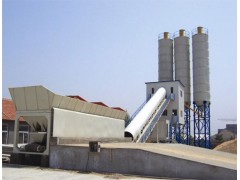 骨料仓采用装载机或上料皮带机上料。骨料仓下部设有弧门给料器,该弧门依靠气缸开启和关闭,同时结合微机集中控制,在配料时,弧门开启给料,能够达到精确配料。称量斗下设一条水平皮带机,上吊挂四只传感器,连同皮带机、称量斗、各种骨料依次累积称量。骨料称量放料由PLC控制,保证精度。皮重超重微机能自动报警,再次称量皮重自动回零。骨料配料完毕,由皮带机送入提升斗内,提升斗沿轨道上升,将骨料卸入搅拌机内。