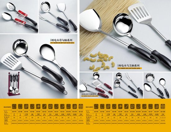 各种不锈钢餐刀,餐勺,汤勺,牛油刀,牛排刀,水果叉,蛋糕叉,咖啡更,茶更,糖更,雪糕更等。产品选用进口高级不锈钢加工生产而成,不沾油,耐磨耐用,做工考究,环保卫生,不发黑,不变形。整体设计精致典雅,带有微翘造型手柄,美观大方,又方便手持。加长、紧凑叉头,方便您叉取蜜饯、水果和西点等各种食物,是您日用、旅行、野营和送礼的最佳选择!