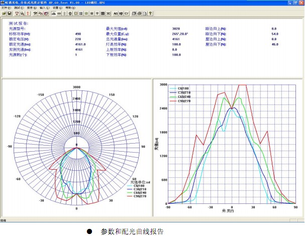 测量灯具的空间光强分布曲线、光强数据、区域光通量、灯具效率、亮度分布、利用系数、亮度限制曲线、眩光等级、概算曲线、最大允许距离比、有效发光角,上射光通量,下射光通量、等照度曲线、等光强曲线等光度参数