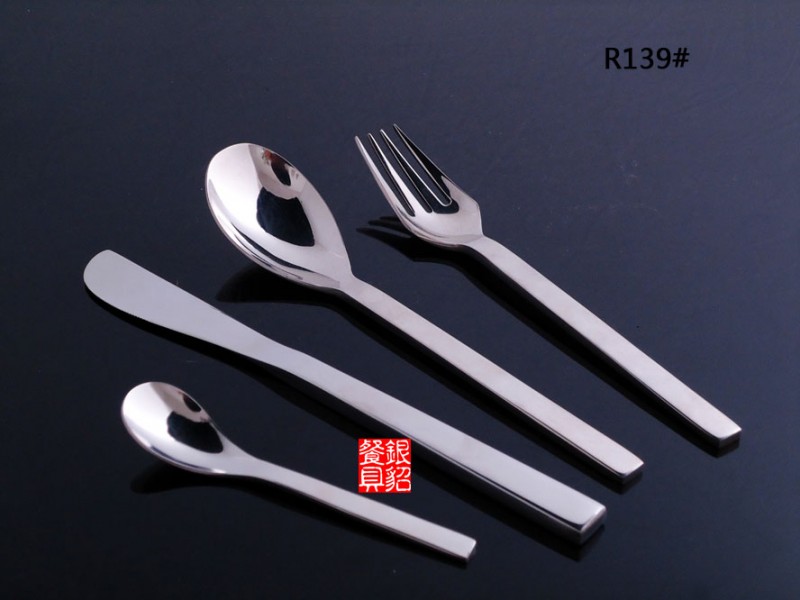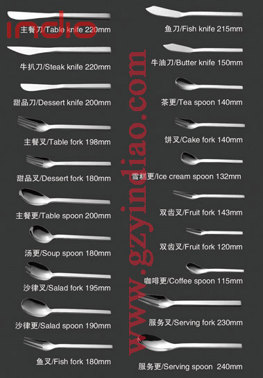 各种不锈钢餐刀,餐勺,汤勺,牛油刀,牛排刀,水果叉,蛋糕叉,咖啡更,茶更,糖更,雪糕更等。产品选用进口高级不锈钢加工生产而成,不沾油,耐磨耐用,做工考究,环保卫生,不发黑,不变形。整体设计精致典雅,带有微翘造型手柄,美观大方,又方便手持。加长、紧凑叉头,方便您叉取蜜饯、水果和西点等各种食物,是您日用、旅行、野营和送礼的最佳选择!