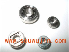 浮动螺母是应用于薄板或钣金上的一种组合螺母,外形呈圆形,里面镶嵌一个螺母,组合后能浮动。外壳一端带有压花齿及导向槽。 广州瑞宏 其原理是通过压花齿压入钣金的预置孔也,一般而方预置孔的孔径略小于压铆螺母的压花齿,通过压力使浮动螺母的花齿挤入板内使导致孔的的周边产生塑性变形,变形物被挤入导向槽,从而产生锁紧的效果。安装方法同压铆螺母。但生产工艺比较复杂,需要自动车床先分别加工两个元件,然后铣床铣出四边并进行组合。