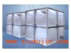 不锈钢组合水箱,由高组合式不锈钢板给水箱、存水箱和低水箱三部分组成。高组合式不锈钢板给水箱内设有机械控制的润水器、冲水阀和泄水阀以及电极浮子开关,润水器和冲水阀的阀座分别与设置在存水箱内的三通冲水管连接,泄水阀开启