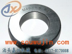 螺纹环规按形式分为整体式螺纹环规(M1-M20)和双柄式螺纹环规(大于M20--M180)两种。按国家标准GB197-81规定,普通螺纹环规的精度常用的为6g ,6h ,6f 和8g级。螺纹标准环规的检测通常用校对塞规,其配合性质是通端量规应当旋合,止端量规则不应旋合。由于受螺距误差、牙形半角误差和旋合力大小的影响,使用量规检测比较合理。