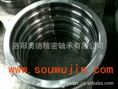 用于磨床高速磨削主轴的角接触球轴承除上述要求外,还要求轴承在极高的转速下运转。为了减少高速时球在离心力和陀螺力矩作用下引起的旋转滑动和自旋,在设计时常采用较小直径的钢球。对于d•n 值高,寿命长的高速主轴还可采用比重轻,耐磨性好的陶瓷球取代钢球,以达到更完美的性能。本公司可依据用户要求提供这种高性能陶瓷球混合轴承。高速磨削主轴常用的轴承类型是B70C、B70CA系列,在重载时也可采用B72C、B72CA系列。保持架采用高强度酚醛夹布管制造,外圈挡边引导可使轴承获得良好的润滑。