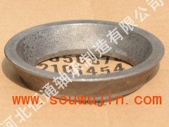 本实用新型提供一种用于调整汽车后桥主减速器中主动锥齿支承轴承预紧力的隔套,其特征是该隔套为一厚壁圆锥台形单节波形套,利用它代替普通的管状隔套和调整垫片,实现无级调整,柔性控制,调整轴承预紧力迅速,简便,可靠,轴承预紧力满足4~6公斤的要求。 一种用于调整汽车后桥主减速器中主动锥齿轮支承轴承预紧力的厚壁管状隔套,其特征在于所说的厚壁管状隔套是圆锥台形的单节波形套,该波形套的波形区为径向凸起的圆弧面,圆弧面两端与圆锥面连接部位为过渡曲面,而且靠近圆锥顶一侧的圆弧的径向夹角α=20°~30°,靠近圆锥底一侧的圆弧的径向夹角β=40°~50°。