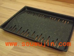 采用先进技术,选用高级超导热不粘材料,运用高压喷涂技术处理,达到涂层不脱落,烤制的食品色泽均匀,不粘的最佳效果。