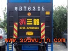 三能的常规尾板(又称为悬臂式尾板):带有五支油缸的悬式支架通过吊板安装固定于汽车尾端的大梁上。通过电控操作,控制尾板板面由垂直状-向后翻开至板面水平-下降至地面-向下倾斜至板面前端与地面贴合。此时可打开车箱门,进行卡车的装卸货物作业,全部过程可由一人操作。安全,捷便。